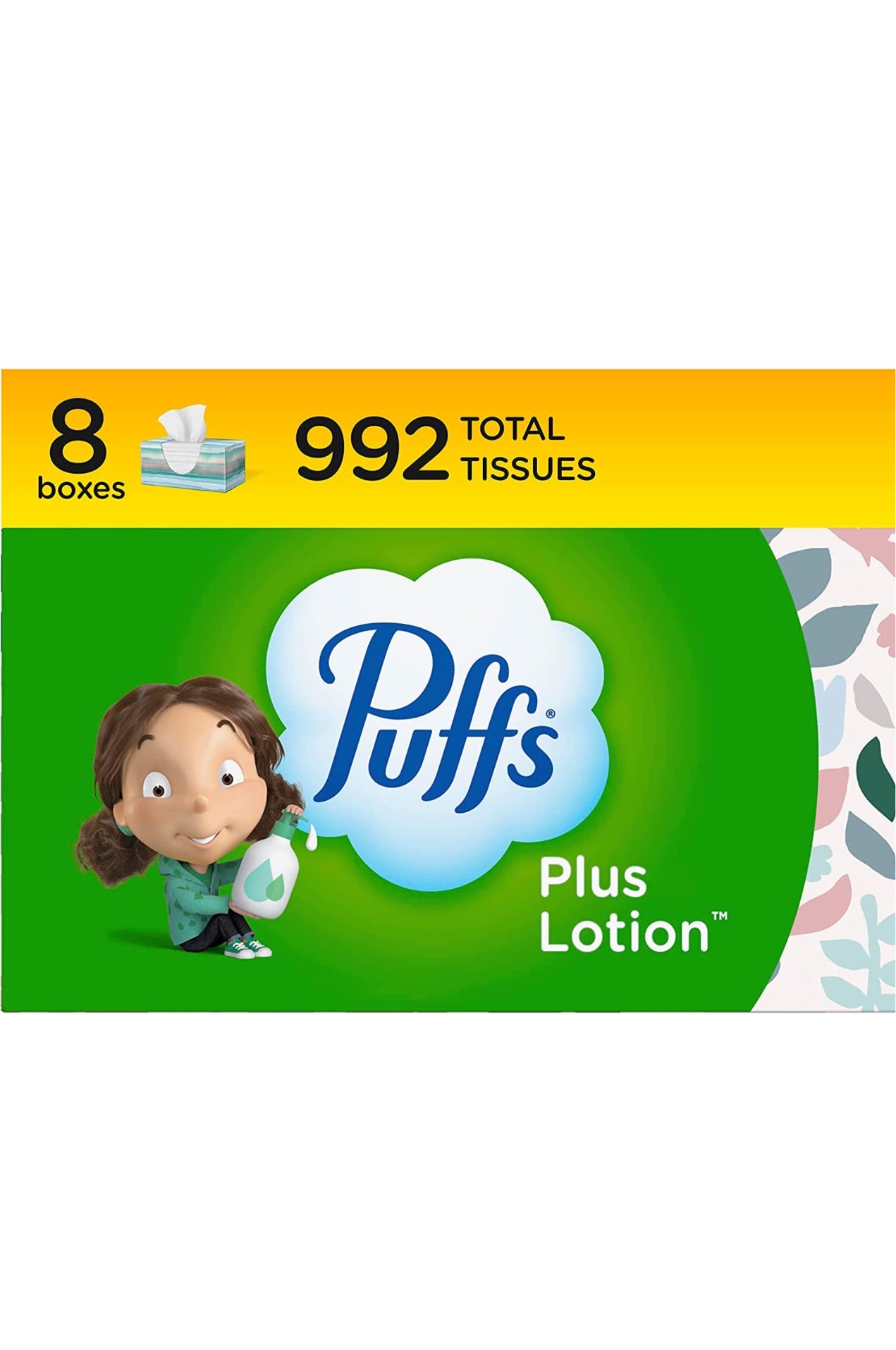 - Pack includes 8 Family Boxes (124 Tissues Per Box) of Puffs Plus Lotion Facial Tissues